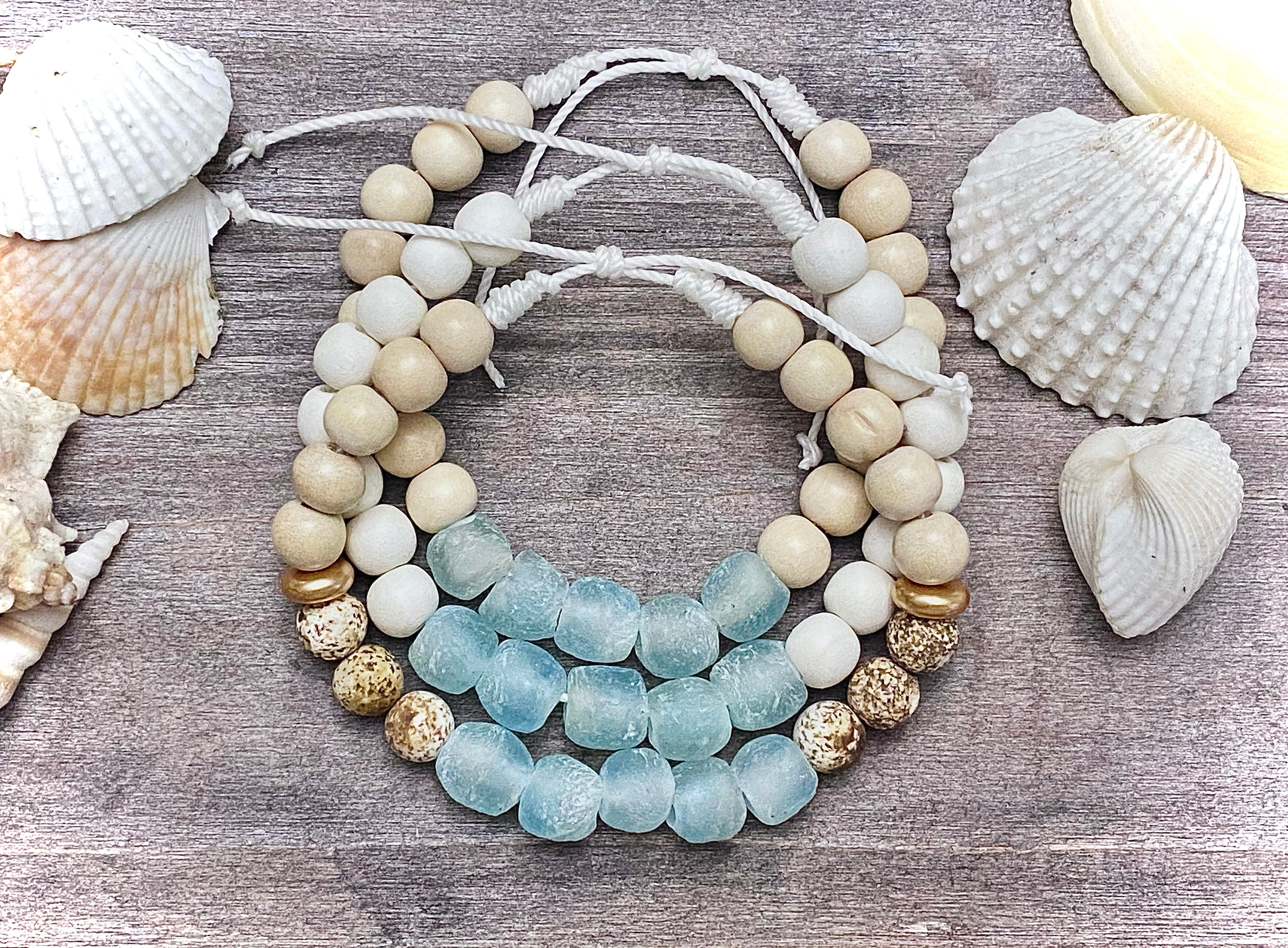 La colección Island presenta pulseras inspiradas en Long Island hechas a mano con cuentas de vidrio reciclado y cuentas de madera natural; cada pulsera está construida con una banda de cordón anudado ajustable que le da a la pulsera su aire playero.