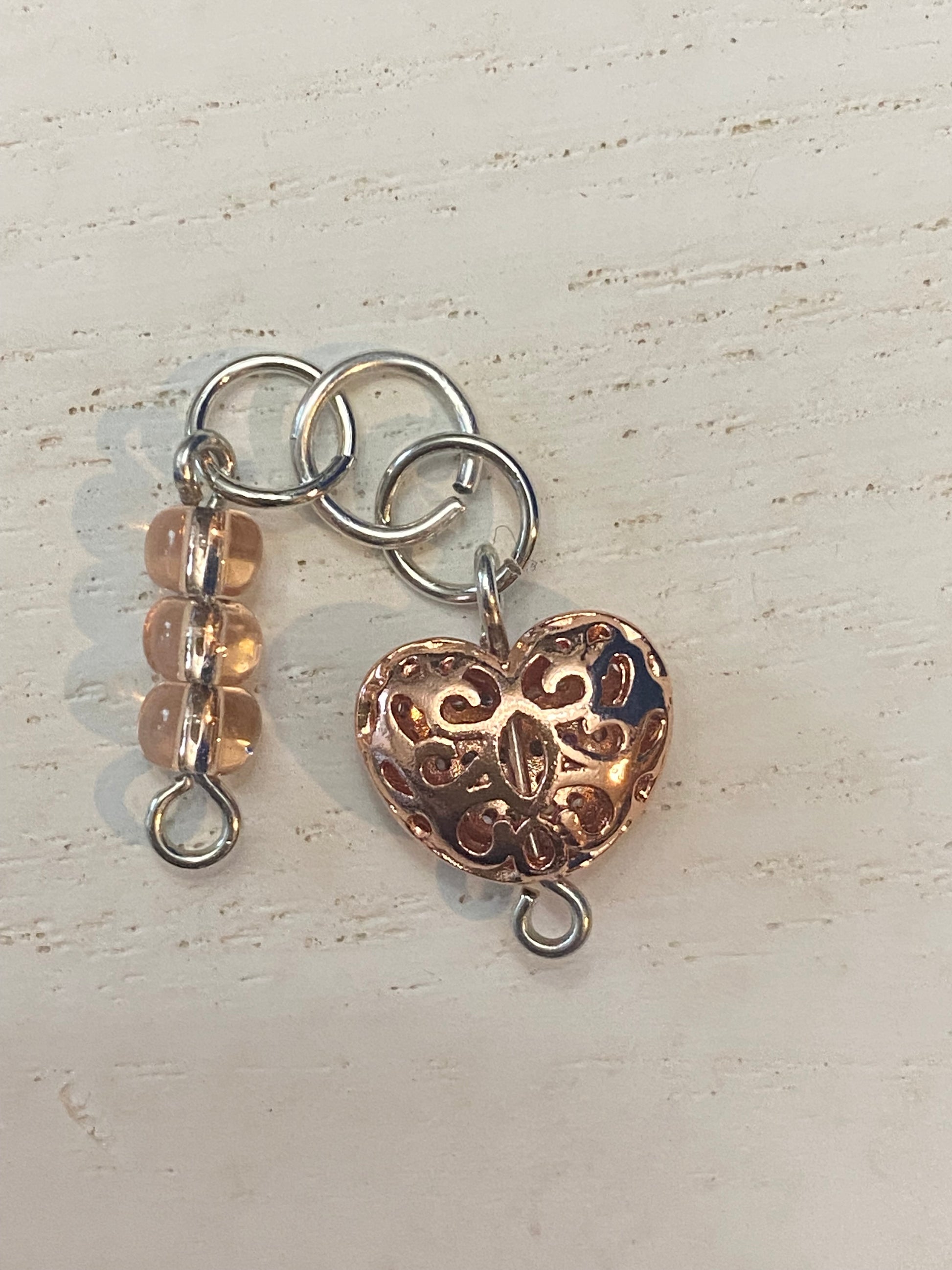 Puffy rose gold tone heart charm with three rose gold glass seed bead accents.