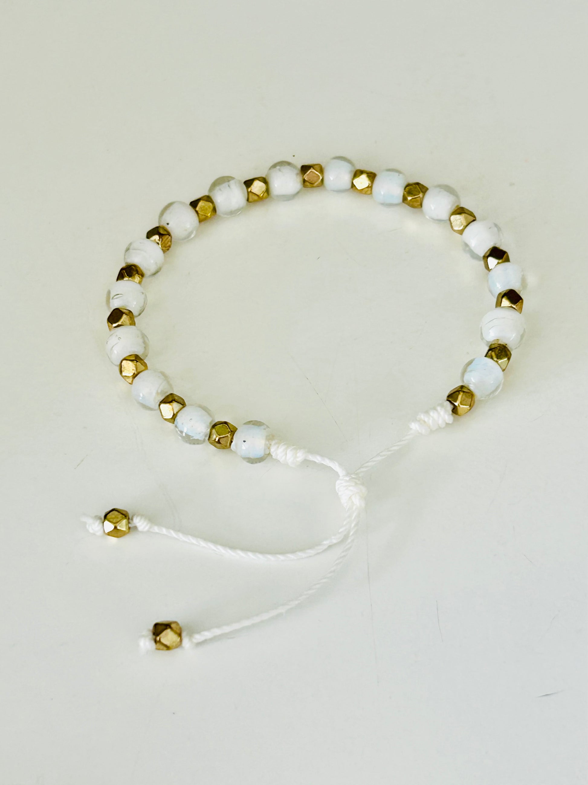 One 7+ in bracelet with White Cloud glass beads and gold tone faceted nuggets on an adjustable nylon cord.