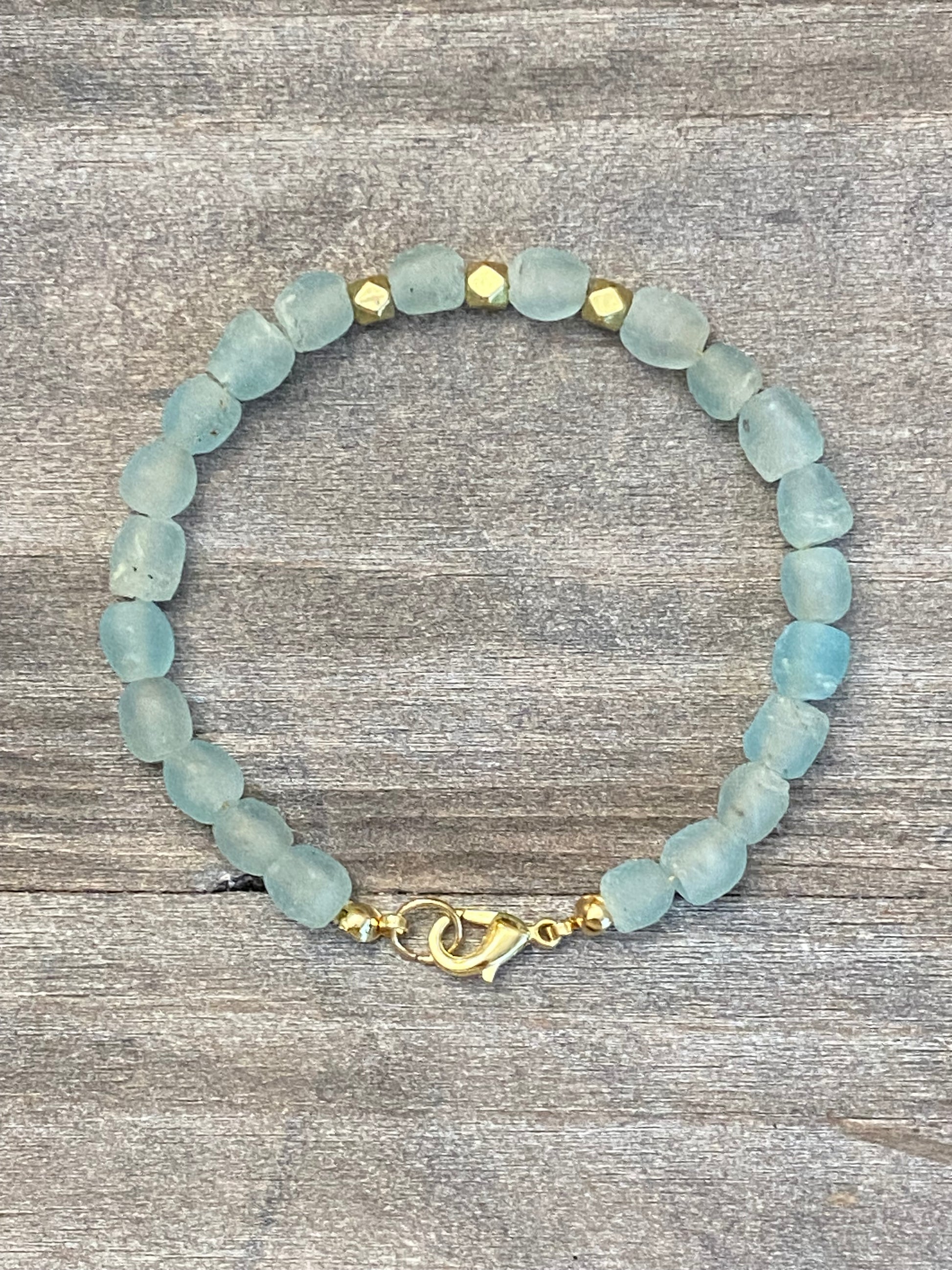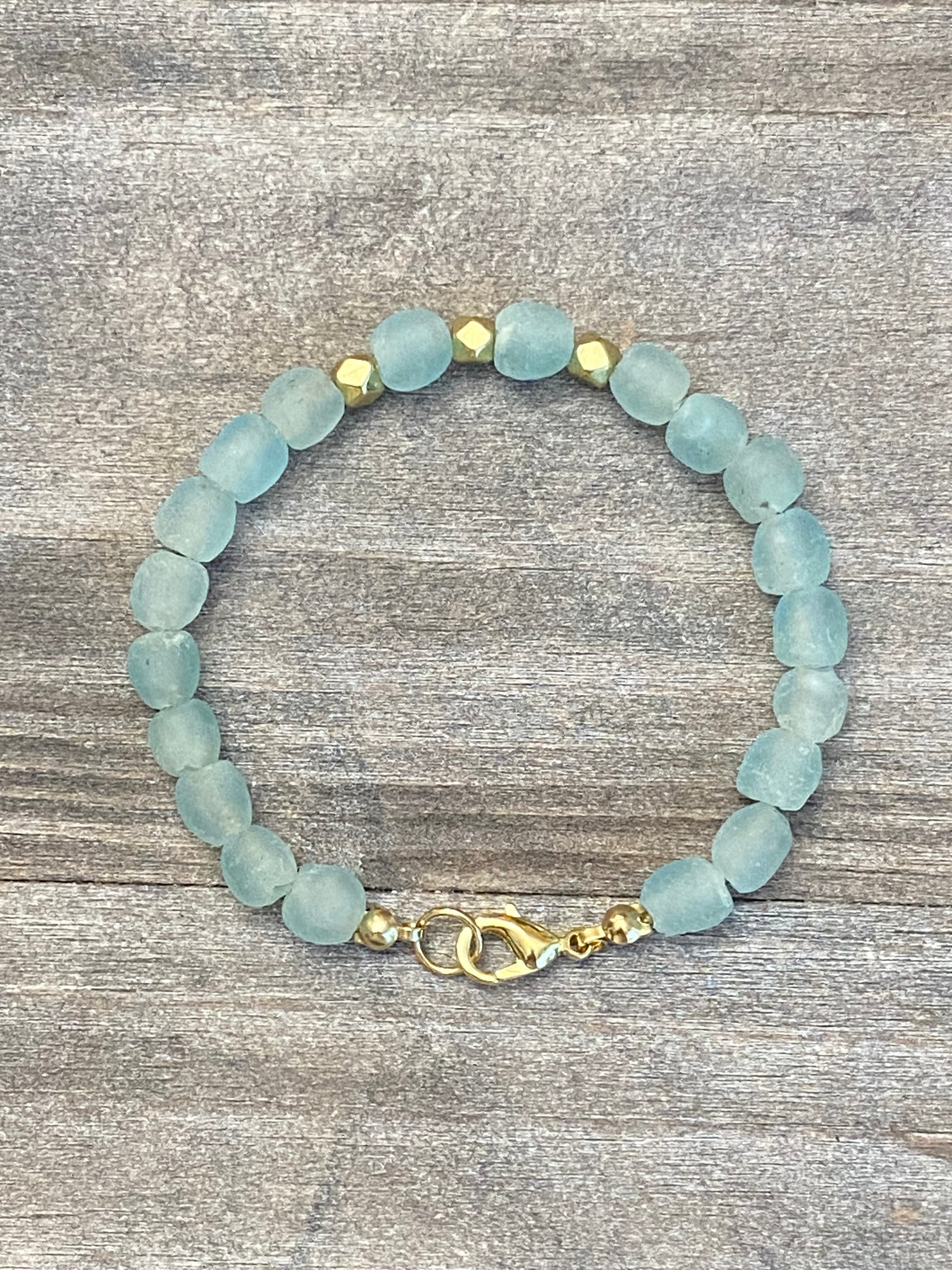 Magnifique bracelet en perles de verre recyclé de couleur aqua translucide avec des tons dorés complémentaires !!