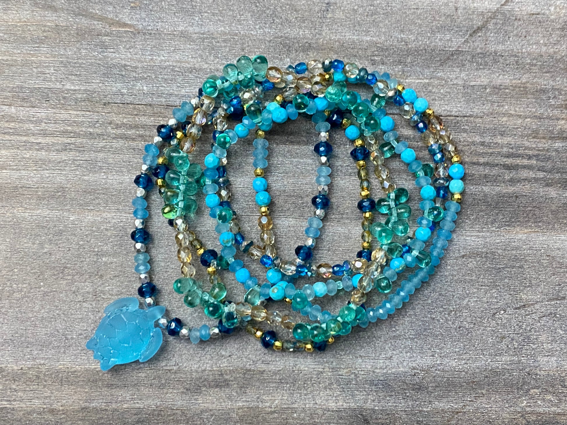 Ocean themed bracelet with a variety of tiny Czech glass beads on an elastic cord